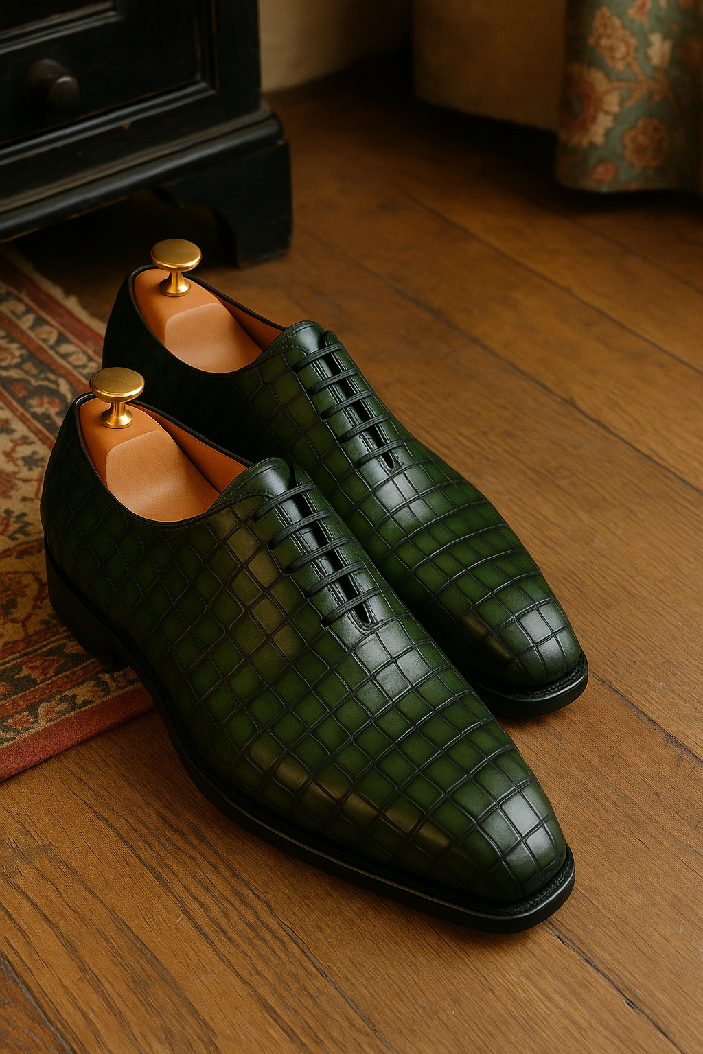 Shop premium handmade green leather dress shoes for men. Perfect for weddings, business, and formal events. Worldwide shipping available.